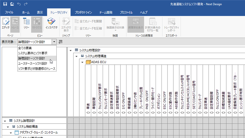 トレースページの表示形式にはツリー形式とマトリクス形式の2種類があり、用途に応じていつでも切り替えられます。 マトリクス形式のトレースページでは、2つのモデルを縦横に並べてトレーサビリティを確認しながら、不足しているトレース情報の追加・削除もできます。