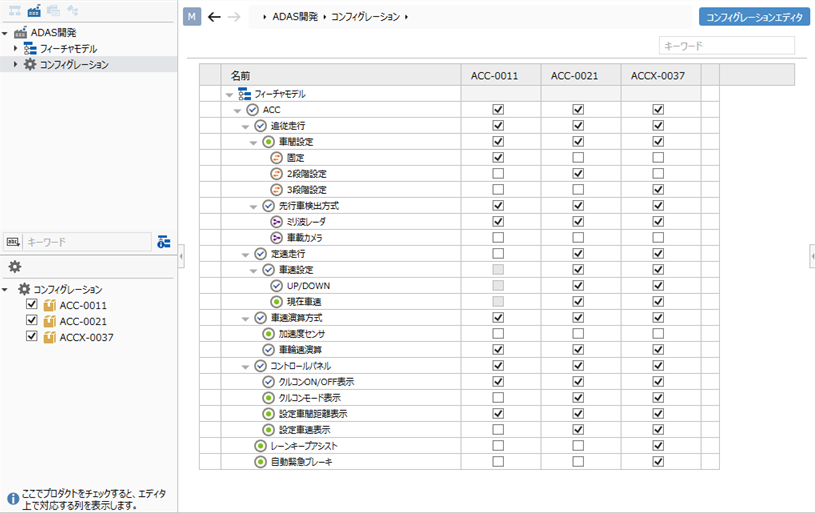 Next Design では、プロダクトライン開発の対象プロダクトを定義し、プロダクトごとに有効なフィーチャを選択することで、プロダクトごとの可変性を決定できます。 この一連の作業を コンフィグレーション と呼びます。
